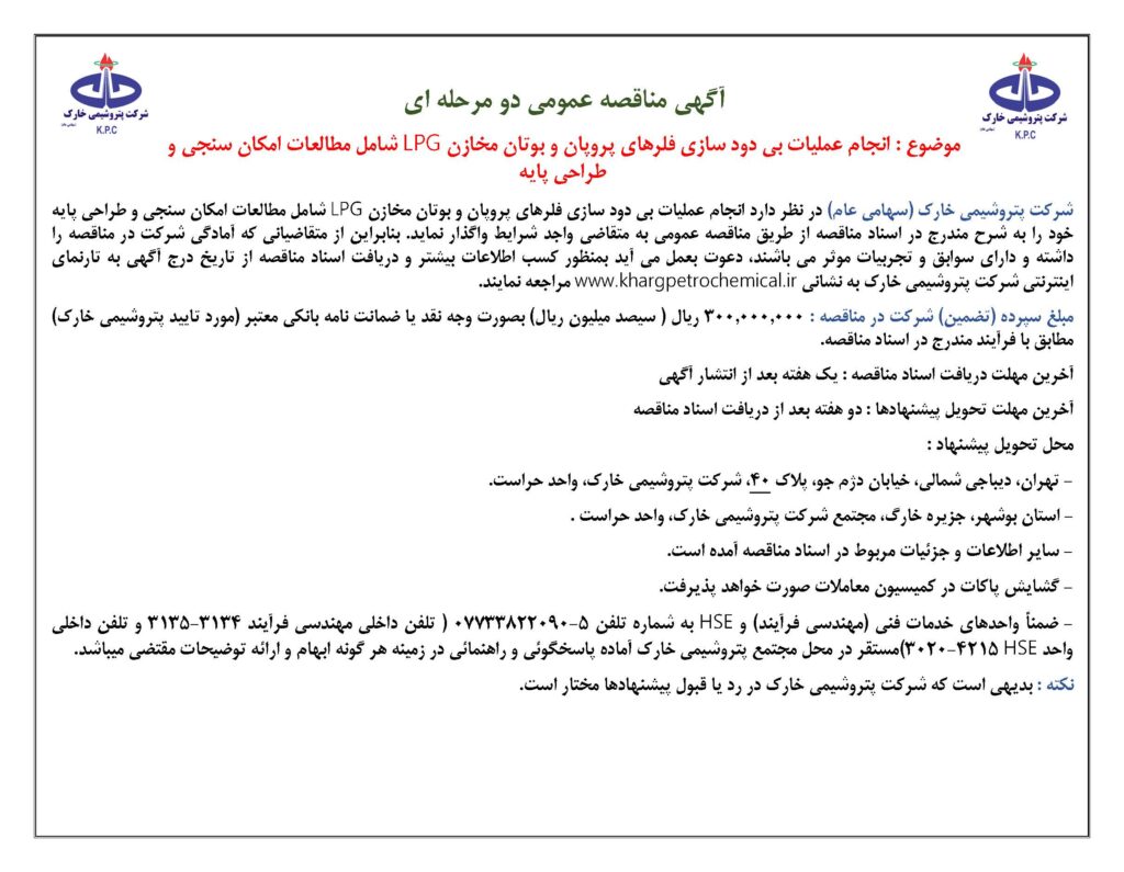 مناقصه عمومی دو مرحله ای انجام عملیات بی دود سازی فلرهای پروپان و بوتان مخازن ال پی جی