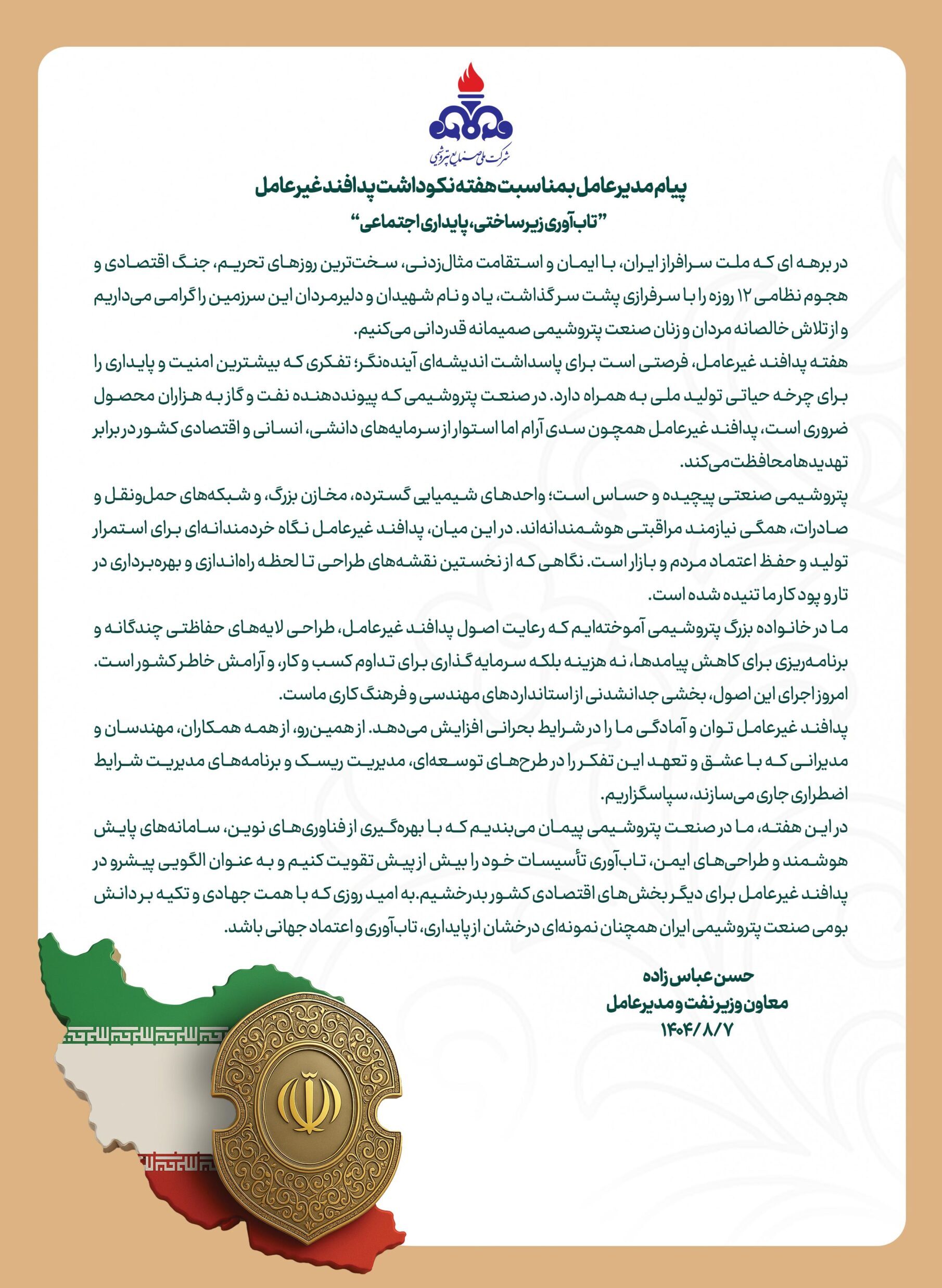 متن پیام مدیرعامل شرکت ملی صنایع پتروشیمی در ذیل می آید: