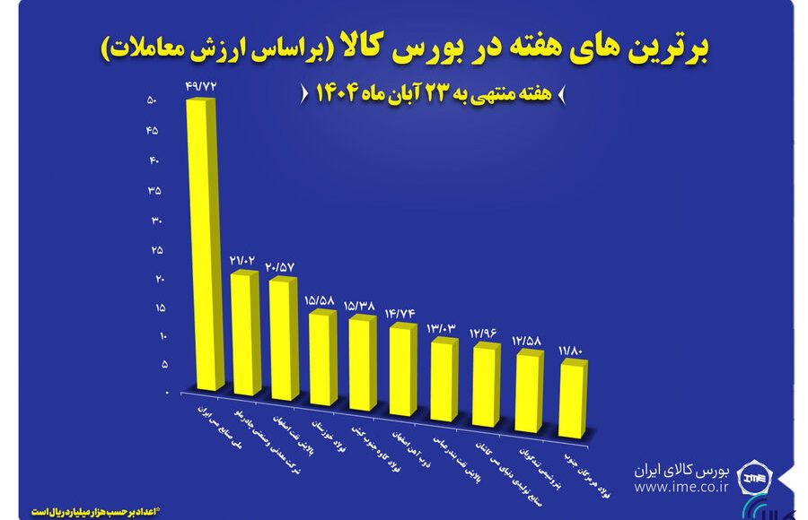 به گزارش “راهبرد انرژی“، برترین های بورس کالای ایران در هفته منتهی به ۲۳ آبان ماه براساس ارزش فروش شرکت ها در بازار فیزیکی به شرح زیر است: