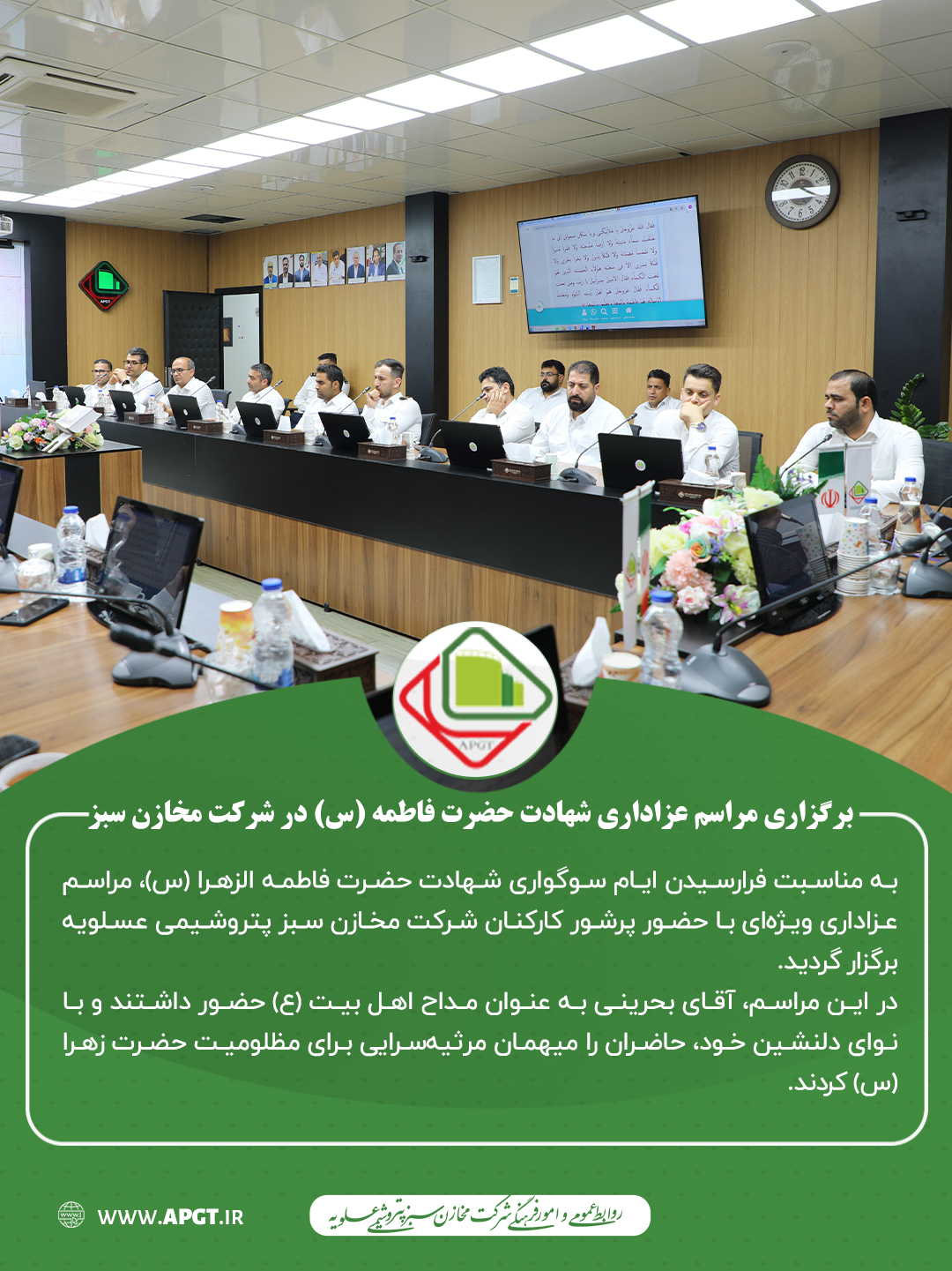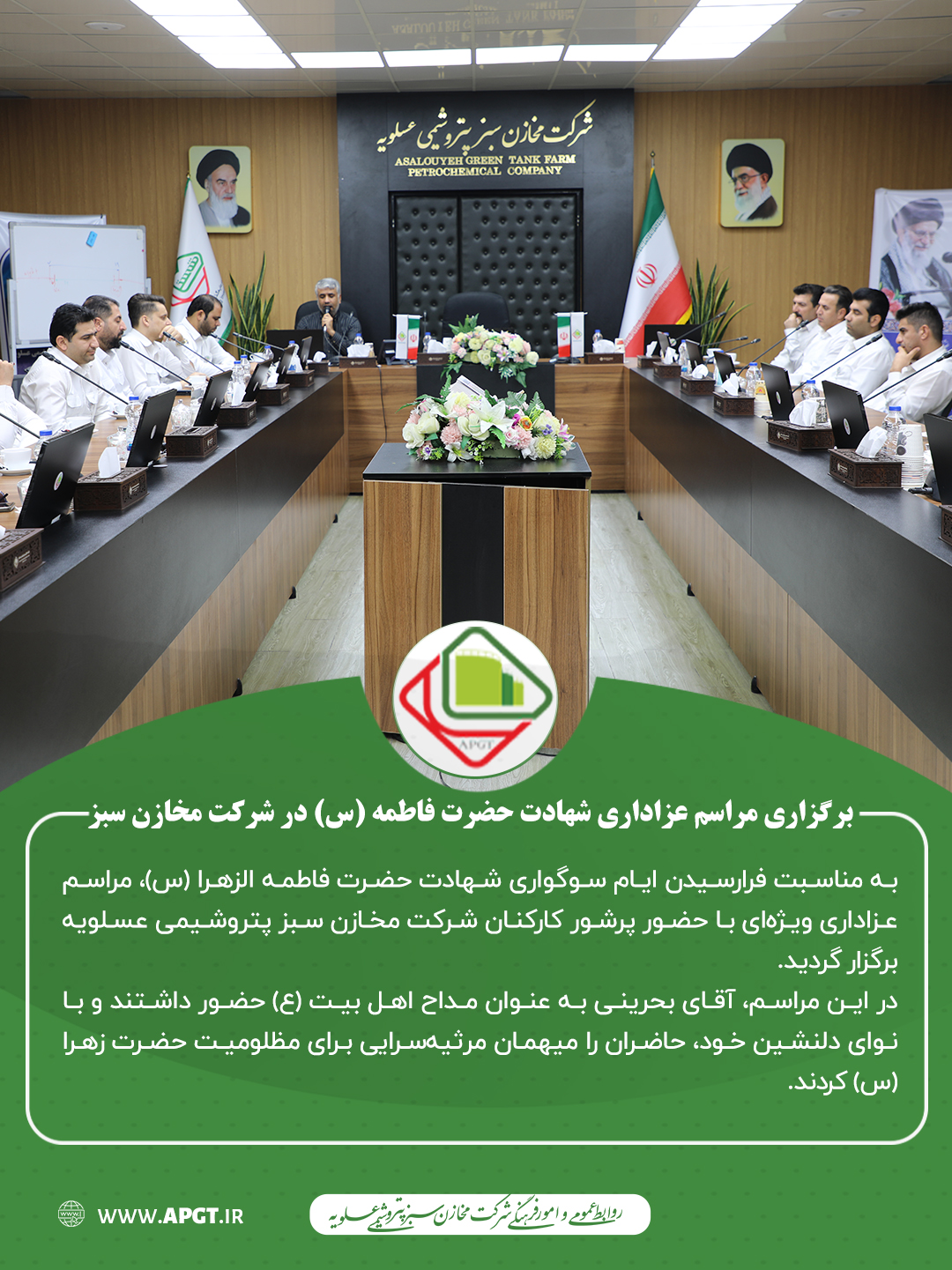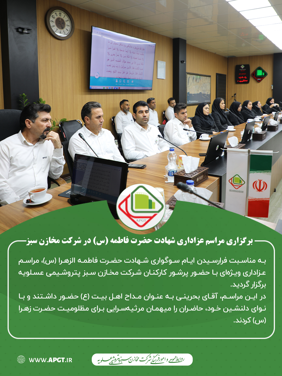 به گزارش “راهبرد انرژی“،به مناسبت فرارسیدن ایام سوگواری شهادت حضرت فاطمه الزهرا (س)، مراسم عزاداری ویژه‌ای با حضور پرشور کارکنان شرکت مخازن سبز پتروشیمی عسلویه برگزار گردید.در این مراسم، آقای بحرینی به عنوان مداح اهل بیت (ع) حضور داشتند و با نوای دلنشین خود، حاضران را میهمان مرثیه‌سرایی برای مظلومیت حضرت زهرا (س) کردند.