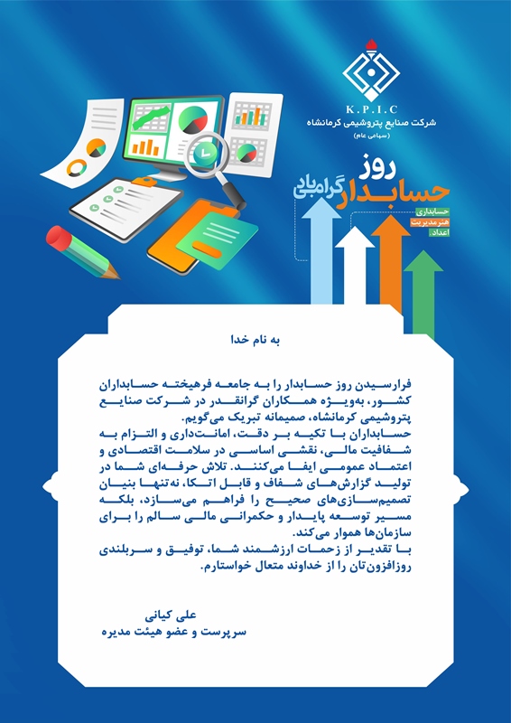 فرارسیدن روز حسابدار را به جامعه فرهیخته حسابداران کشور، به‌ویژه همکاران گرانقدر در شرکت صنایع پتروشیمی کرمانشاه، صمیمانه تبریک می‌گویم.