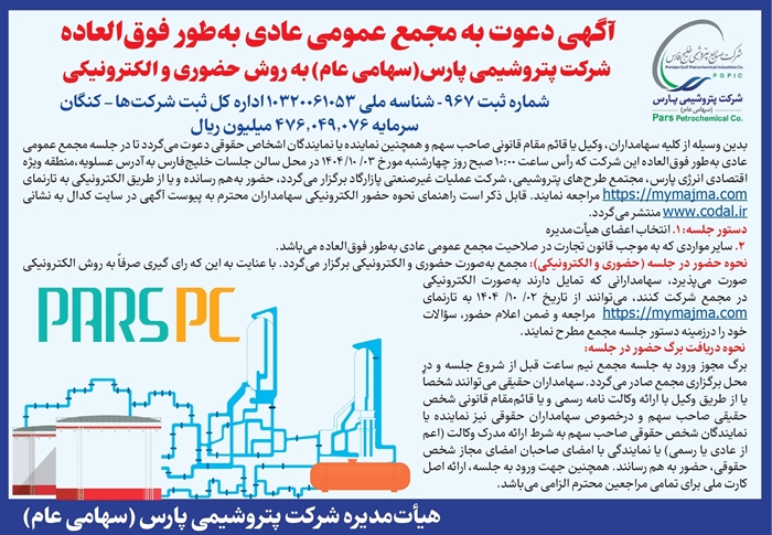 بدینوسیله از کلیه سهامداران، وکیل یا قائم مقام قانونی صاحب سهم و همچنین نماینده یا نمایندگان اشخاص حقوقی دعوت میگردد تا در جلسه مجمع عمومی عادی به طور فوق العاده این شرکت که رأس ساعت ۱۰:۰۰ صبح روز چهارشنبه مورخ ۱۴۰۴/۱۰/۰۳ در محل سالن جلسات خلیج فارس به آدرس عسلویه، منطقه ویژه اقتصادی انرژی پارس، مجتمع طرحهای پتروشیمی، شرکت عملیات غیرصنعتی پازارگاد برگزار میگردد، حضور به هم رسانده و یا از طریق الکترونیکی به تارنمای https://mymajma.com مراجعه نمایند.