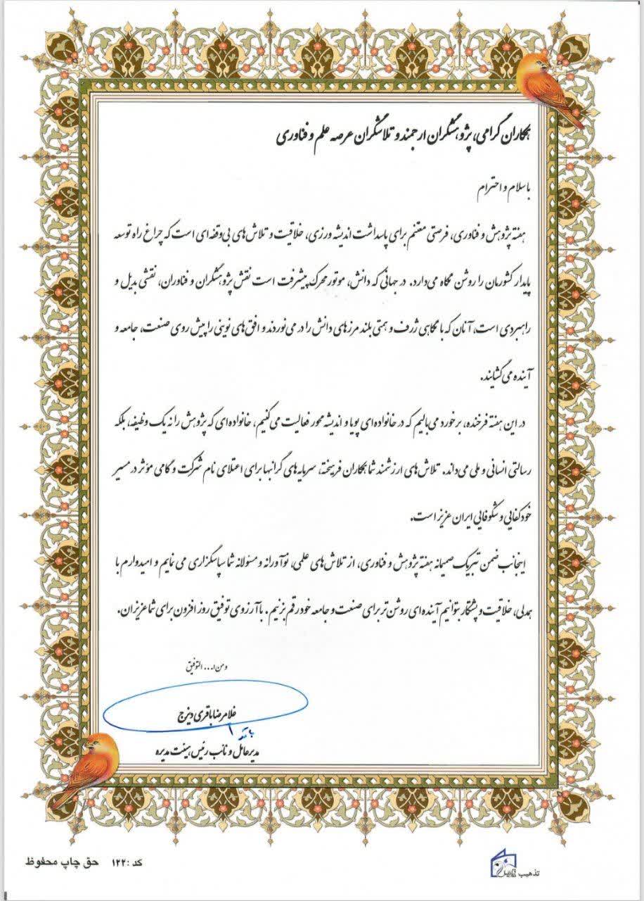 در این میان، تلاشهای ارزشمند شما در مسیر گسترش مرزهای دانش و تولید علم، شایسته قدردانی است. بیشک استمرار این فعالیتها، زمینهساز ارتقای جایگاه علمی کشور و پاسخگویی به نیازهای جامعه و صنعت خواهد بود.