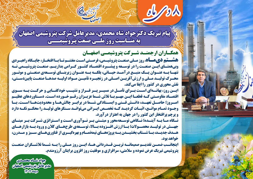 هشتم دی ماه روز ملی صنعت پتروشیمی فرصتی است مغتنم تا با افتخار، جایگاه راهبردی و بی همتای این صنعت را در توسعه و پیشبرد اقتصاد کشور گرامی بداریم صنعت پتروشیمی نه تنها به عنوان یک منبع درآمد حیاتی بلکه به عنوان زیربنای توسعه ی صنعتی و موتور محرک تولید ملی و ارزش آفرین اصلی در زنجیره تأمین مواد اولیه صدها صنعت پایین دستی نقش محوری در کشور را ایفا میکند