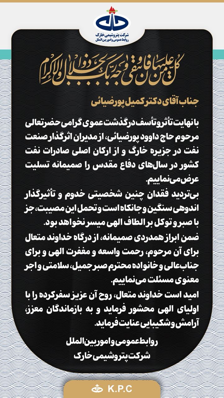 پیام تسلیت مدیریت روابط عمومی پتروشیمی خارک در پی درگذشت عموی مدیرعامل این شرکت