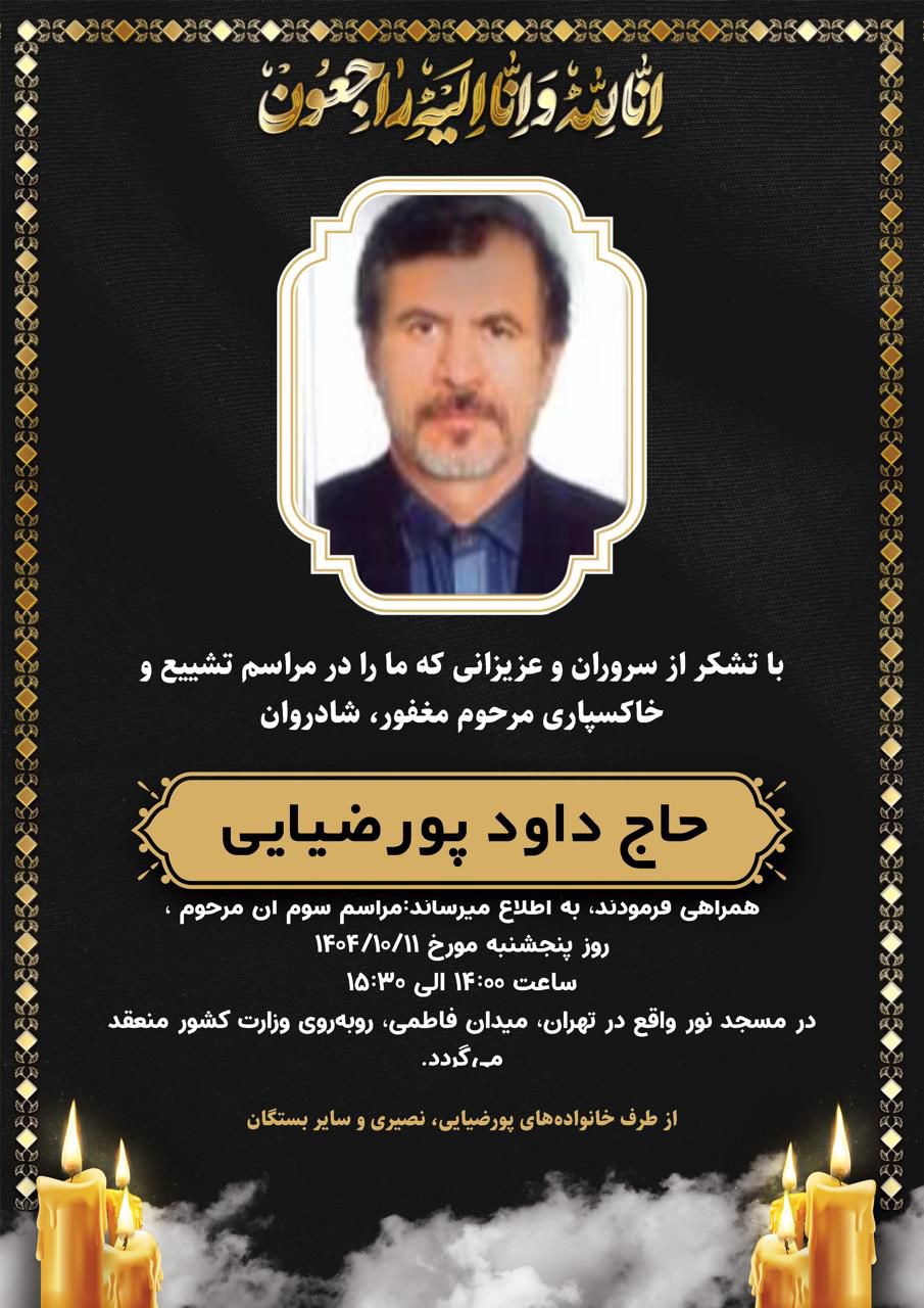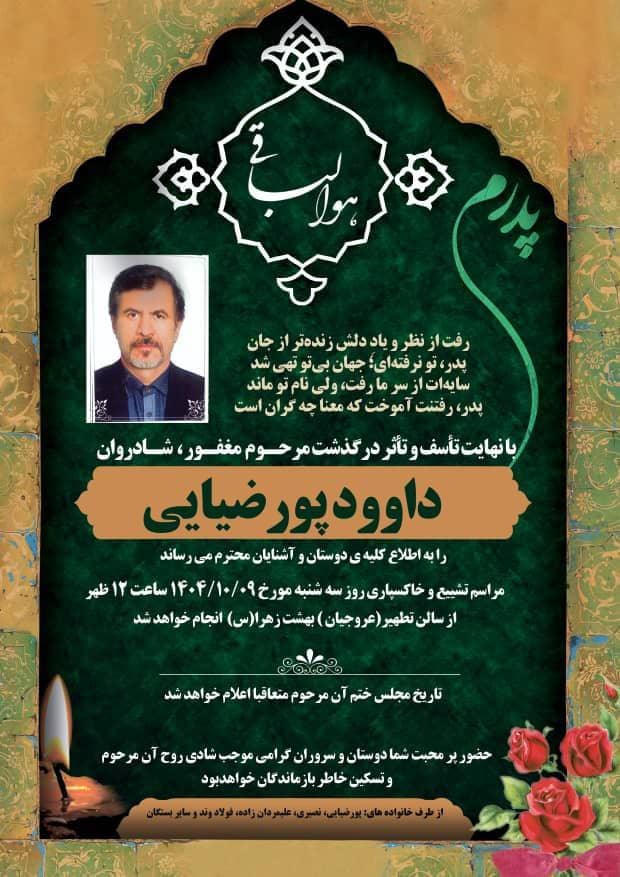 با نهایت تاثر و تاسف درگذشت عموی گرامی حضرتعالی مرحوم حاج داوود پورضیائی، از مدیران اثرگذار صنعت نفت در جزیره خارک و از ارکان اصلی صادرات نفت کشور در سال های دفاع مقدس را صمیمانه تسلیت عرض می نماییم.