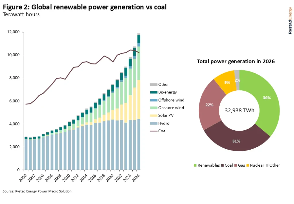 در سال ۲۰۲۶، پیش‌بینی می‌شود تولید از منابع تجدیدپذیر به ۱۱۹۰۰ تراوات‌ساعت برسد و از زغال‌سنگ به عنوان بزرگ‌ترین منبع تولید پیشی بگیرد. برای دهه‌ها، برق زغال‌سنگ بزرگ‌ترین منبع تولید بوده و تقریباً ۴۰ درصد از ترکیب انرژی در سال ۲۰۰۰ را تشکیل می‌داده است. با توجه به اینکه عملاً تمام تقاضای جدید با منابع تجدیدپذیر تأمین می‌شود، تولید زغال‌سنگ به ثبات رسیده است که نشانه‌ای مهم در تولید برق محسوب می‌شود.