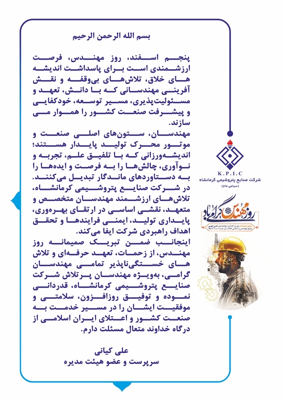 اینجانب ضمن تبریک صمیمانه روز مهندس، از زحمات، تعهد حرفهای و تلاشهای خستگیناپذیر تمامی مهندسان گرامی، بهویژه مهندسان پرتلاش شرکت صنایع پتروشیمی کرمانشاه، قدردانی نموده و توفیق روزافزون، سلامتی و موفقیت ایشان را در مسیر خدمت به صنعت کشور و اعتلای ایران اسلامی از درگاه خداوند متعال مسئلت دارم.