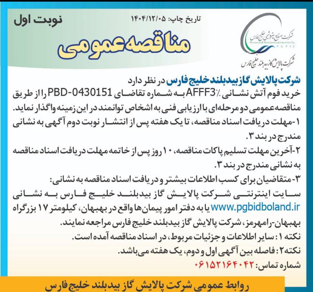 آگهی مناقصه عمومی دو مرحله ای با ارزیابی فنی خرید فوم آتش نشانی AFFF٣% به شماره تقاضای ٠۴٣٠١۵١-PBD