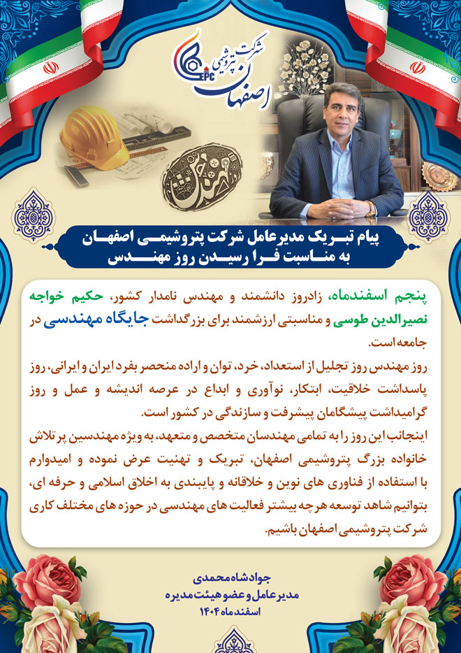 پیام تبریک مدیرعامل شرکت پتروشیمی اصفهان به مناسبت فرا رسیدن روز مهندس
