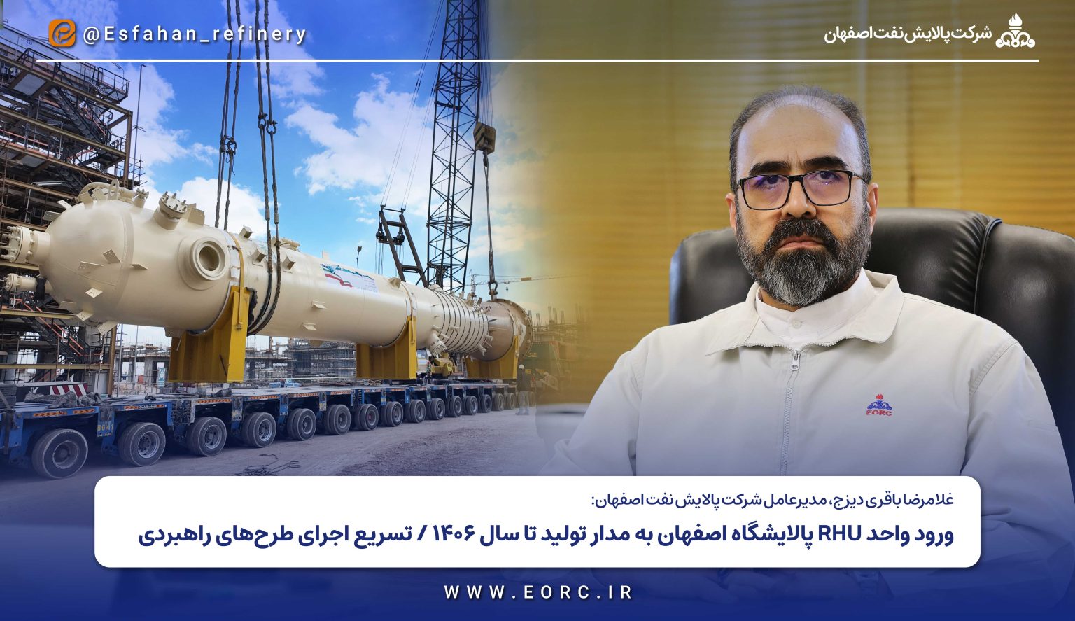 مدیرعامل شرکت پالایش نفت اصفهان در تشریح آخرین وضعیت پروژه RHU با بیان اینکه پیش‌بینی می‌شود فاز نخست این پروژه تا اوایل سال ۱۴۰۶ به بهره‌برداری برسد، تصریح کرد: بخش نخست راکتورهای این واحد وارد سایت شده، بخش دوم به بندرعباس رسیده و در انتظار دریافت بخش سوم هستیم. از مجموع شش کمپرسور پروژه، چهار دستگاه به سایت منتقل شده و برنامه‌ریزی برای حمل دو دستگاه دیگر در حال انجام است. عملیات نصب تجهیزات سنگین از جمله ظروف پرفشار نیز آغاز شده و تاکنون تعدادی از آن‌ها نصب شده‌اند.