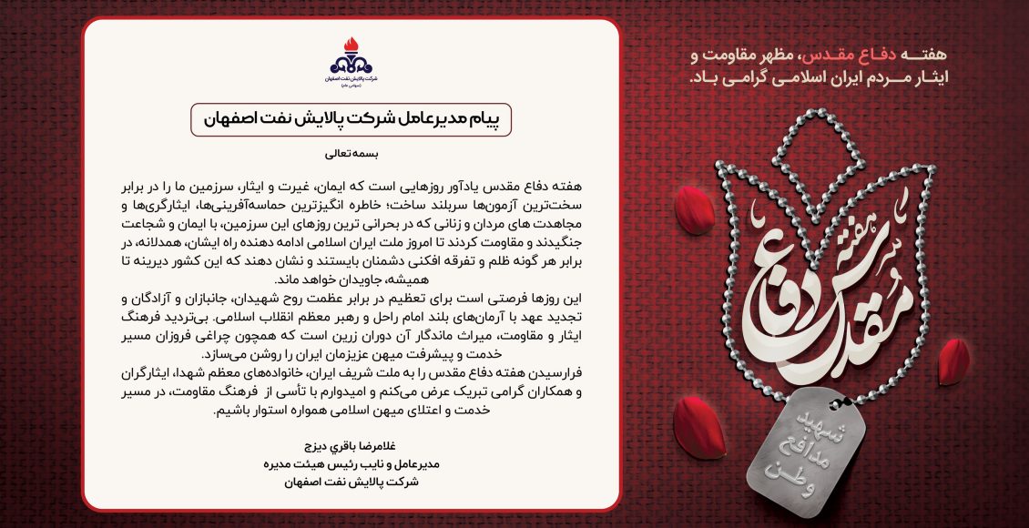 مراسم گرامیداشت هفته دفاع مقدس با حضور مسئولان استان در شرکت پالایش نفت اصفهان برگزار شد. مدیرعامل این شرکت با اشاره به ارزش بزرگداشت این روز، بر احترام به رشادت‌های بزرگان انقلاب تأکید کرد و از لزوم درس گرفتن از گذشته سخن گفت.